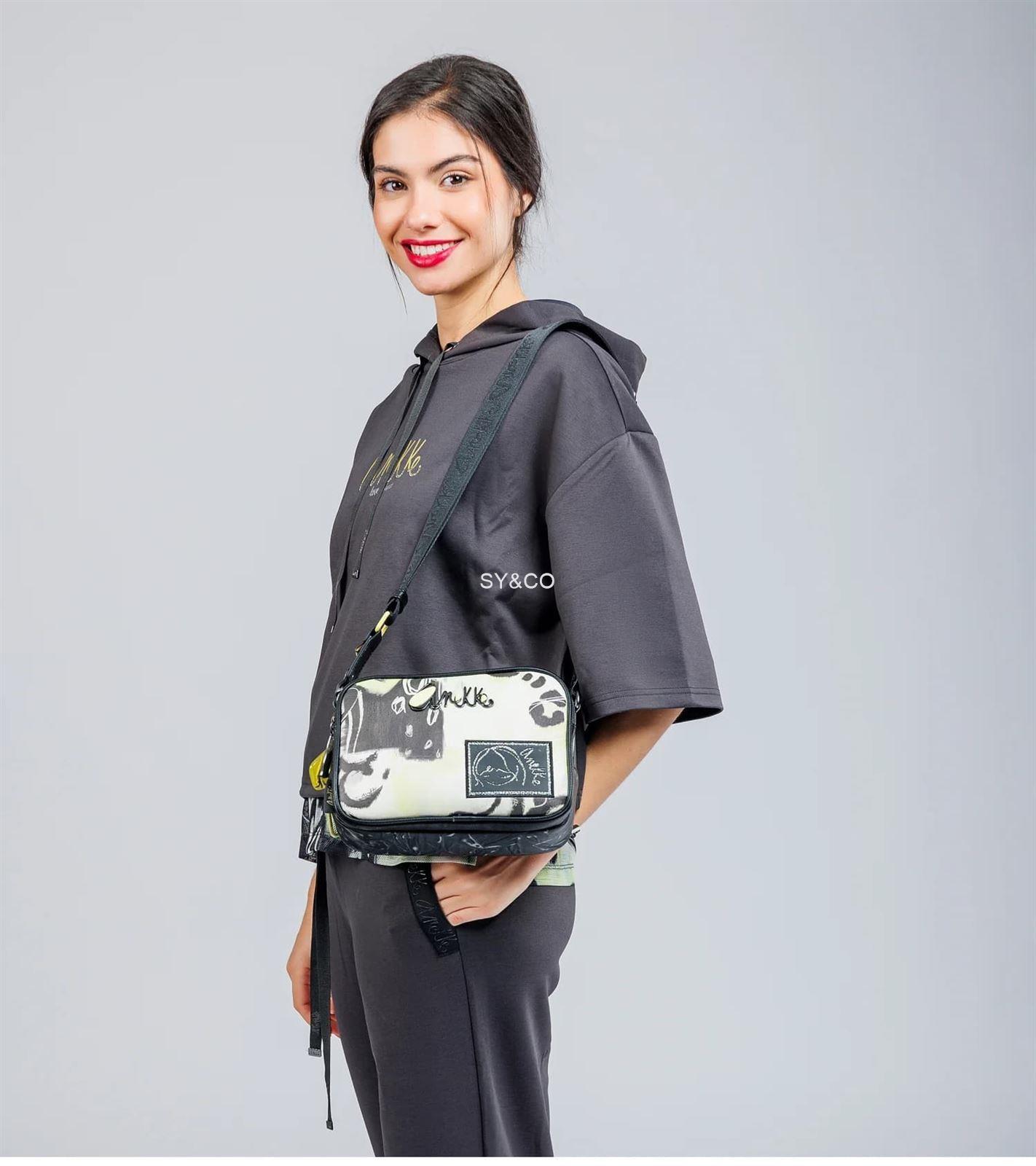 Bandolera Anekke de la colección Nature Towanda. El gatito de Anekke, ha sido su compañero de viajes, motivo por el que se ha convertido en el protagonista de esta original colección Su diseño se inspira en la silueta de Towanda, el gatito de Anekke, con originales toques en tono flúor. Cada producto ha sido realizado con un 80% de material reciclado, y cuenta con el sello Control Union Certifications B.V.