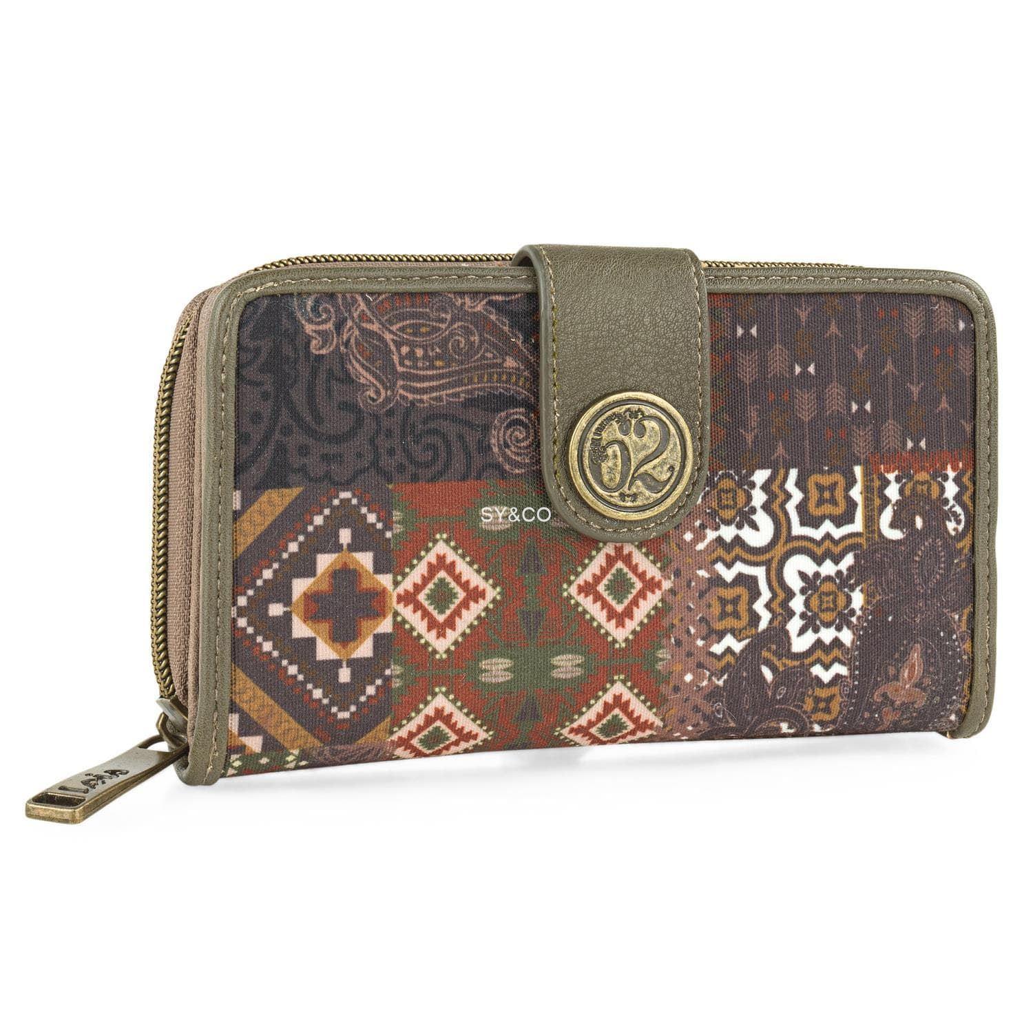 Billetera de Lois en polipiel y lona en tonos marron y kaki con patch en estampado étnico
