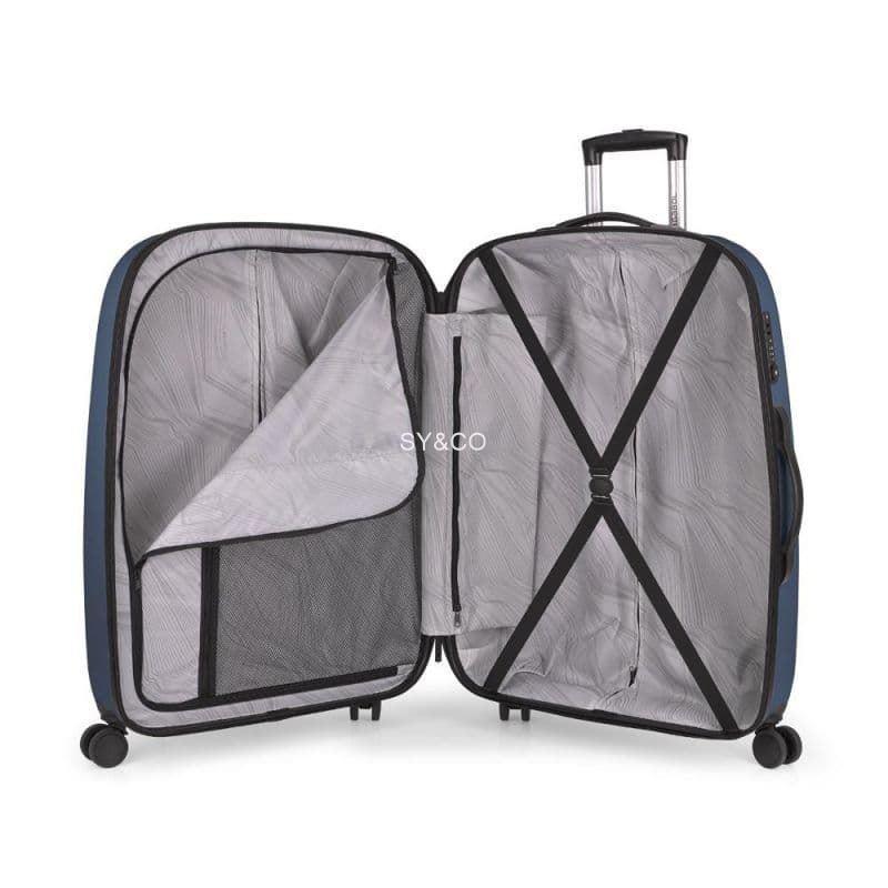 Maleta de tamaño gran rígida, con capacidad de hasta 100 L y 4 ruedas dobles. El material de fabricación es ABS y su interior está compuesto por un forro de alta calidad y separador interior. Cerradura TSA.