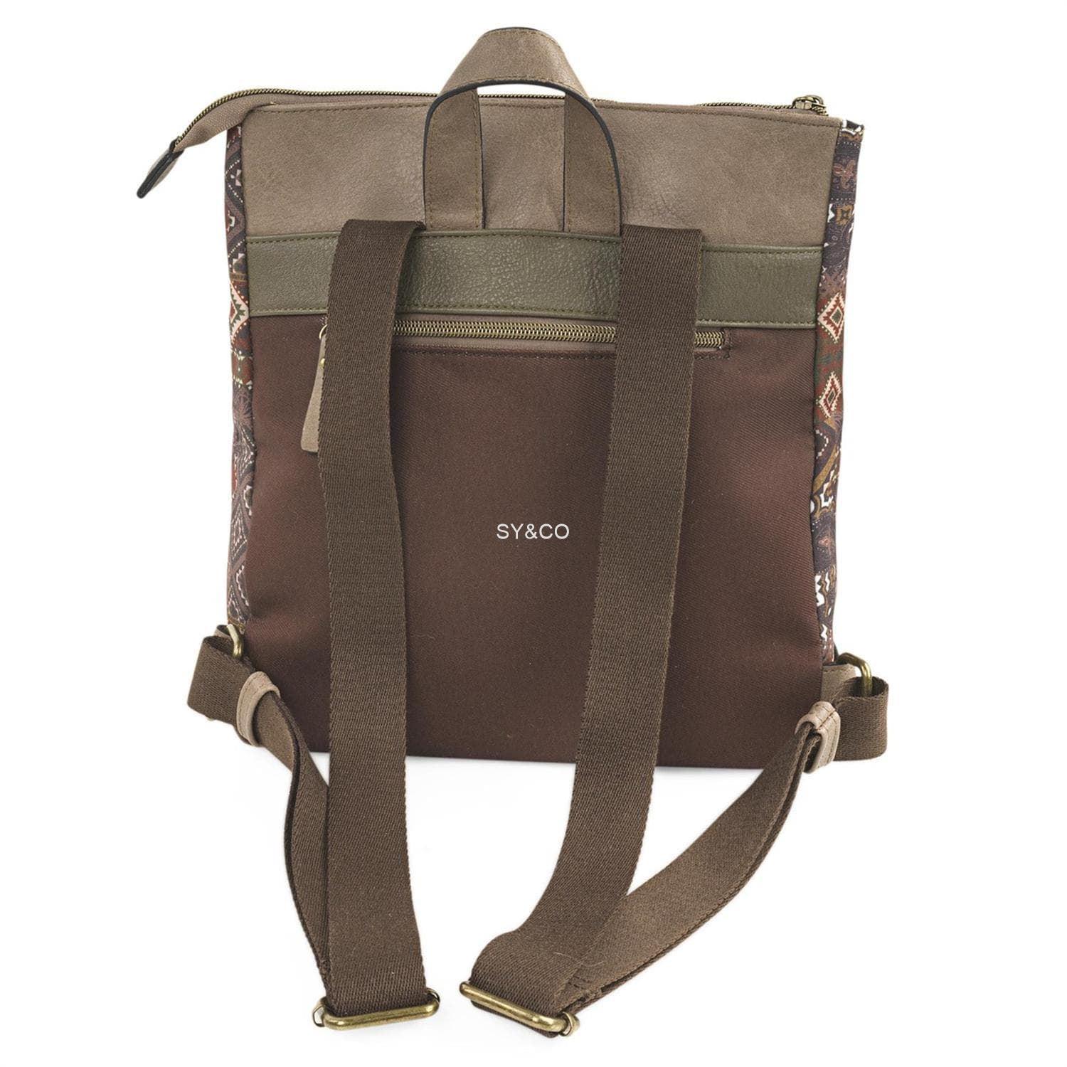 Mochila cuadrada de Lois en polipiel y lona en tonos marrones y kaki con patch de estampado étnico.